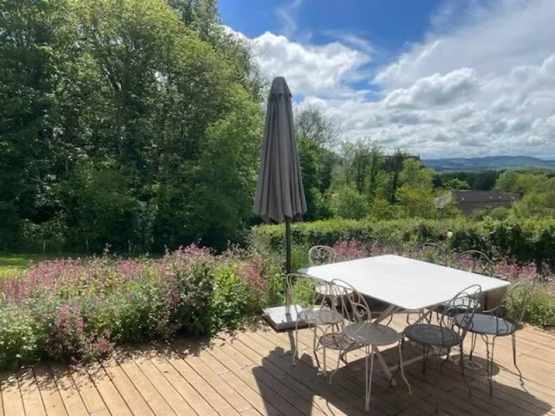 Sortis de la maison, une grande terrasse pour vous accueillir dans vos moments détentes, repas et un accès à une plancha. Vous profitez d’un grand terrain privatisé qui vous donne l’impression d’être seul au monde. Entourés des près, des champs et des forêts de Douglas, venez vous ressourcer dans ce petit coin de verdure et de tranquillité.