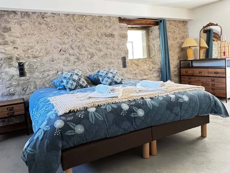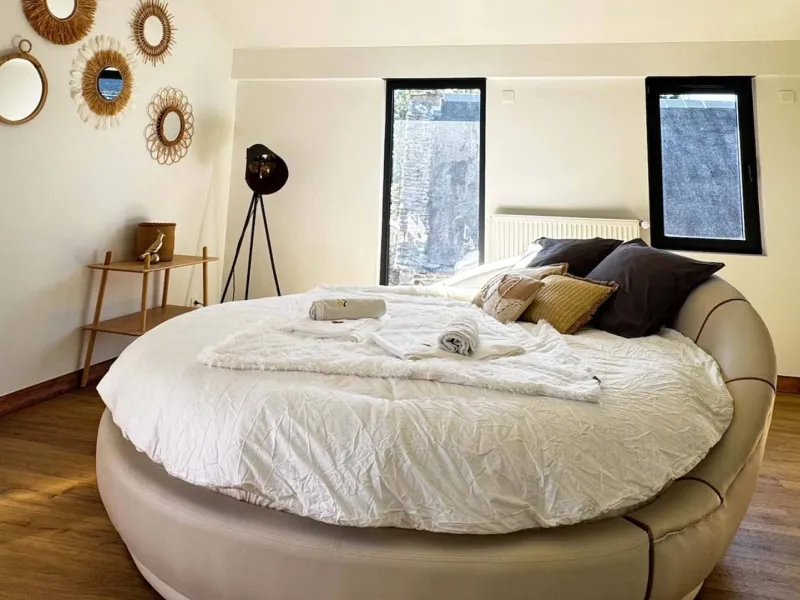 3 suites avec lit double (lit 160, 180 et rond 240), 1 chambre double (lit 200), 1 chambre (lit 160), 1 chambre enfant (1 lit 140 et 2 lits 90) et home cinéma (canapé convertible lit 150).