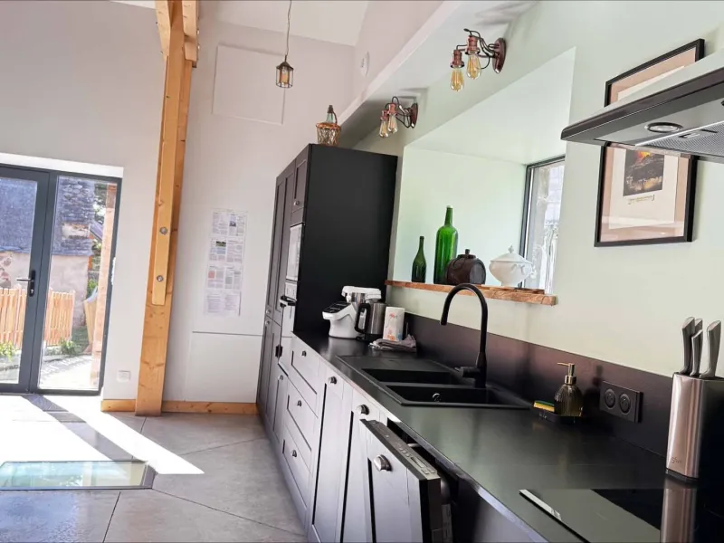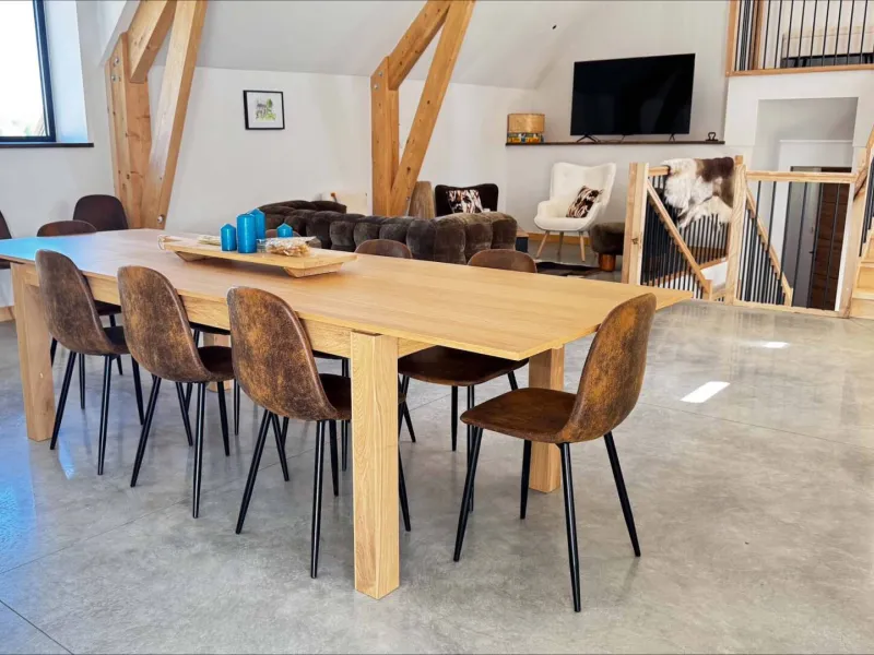 Un grand espace cuisine et salle à manger pouvant recevoir 20 personnes ; 1 salon cosy