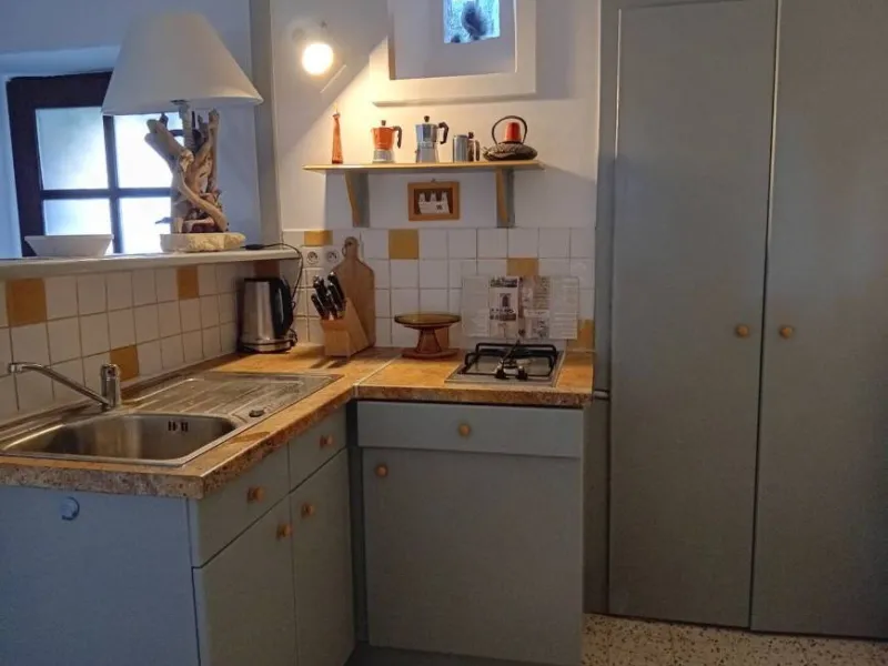 A gauche, le coin cuisine bien équipé, et la salle d’eau avec douche et toilettes.