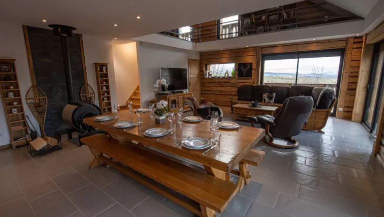 Très grande terrasse tout autour de la maison avec au sud espace repas et au nord (face à la chaine des puy et au Puy de Dôme) espace détente avec chaises longues et grand jacuzzi autonettoyant pour 6 personnes